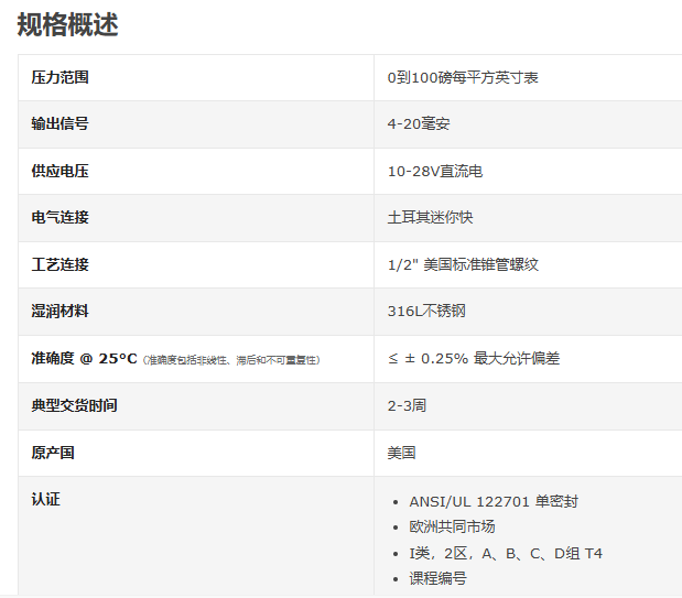 CORE SENSORS 防爆压力变送器100 PSI系列